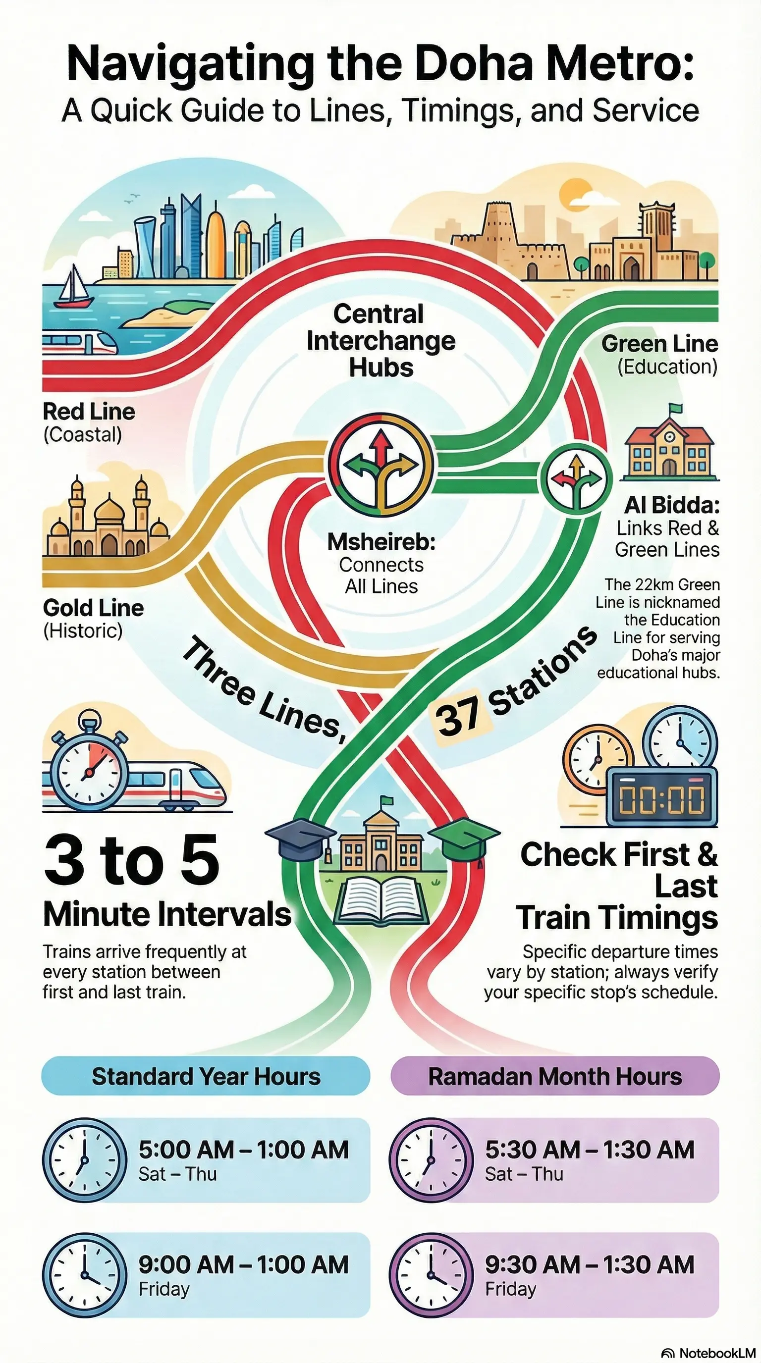 Complete visual guide to Doha's metro network with all routes, including connections and timings.